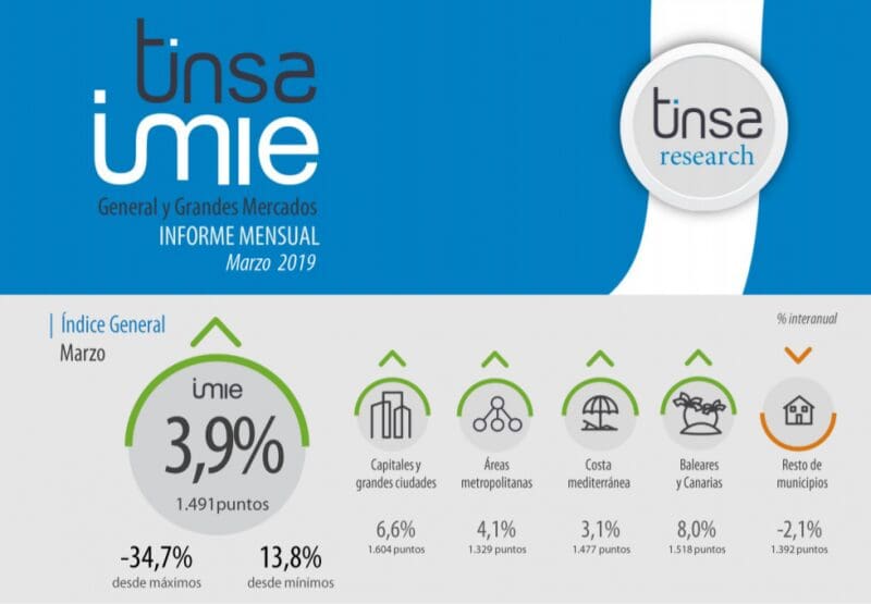 Le prix moyen des logements terminés (neufs et d’occasion) en Espagne n’a pas évolué entre février et mars 2019, comme en témoignent les statistiques réalisées par Tinsa IMIE General y Grandes Mercados.
