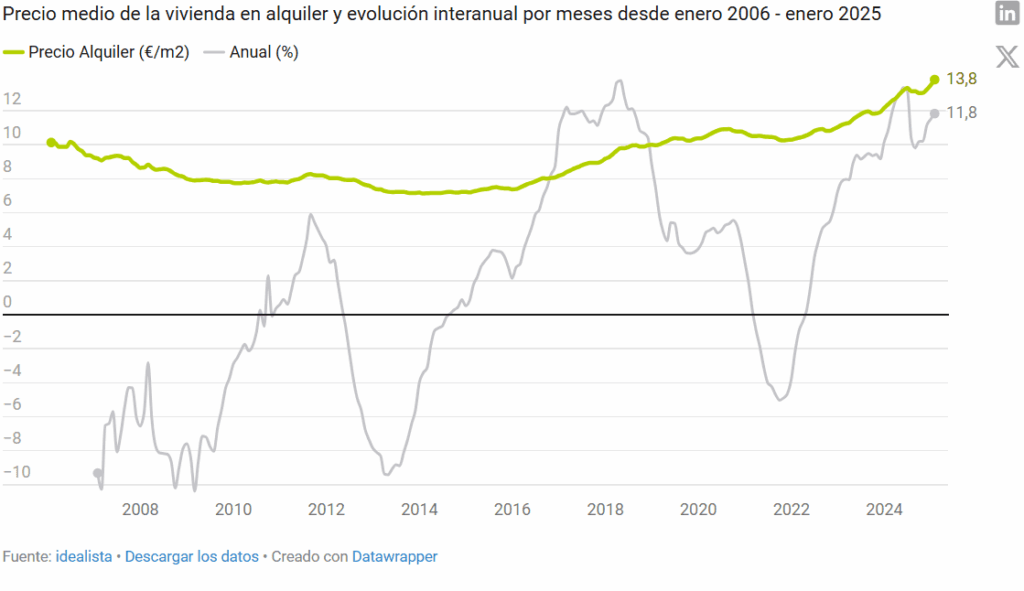 Le mois de janvier s’est achevé sur une hausse du prix des loyers en Espagne de 11,8% en glissement annuel et s’établit à 13,8 euros/m2, selon le dernier rapport sur les prix publié par idealista. Au cours des 3 derniers mois, le prix a augmenté de 6%, tandis qu’au cours du dernier mois, la hausse a été de 2,1%.