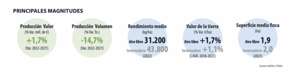 La valeur de la production de légumes et de serres s’est élevée à 8.482 millions d’euros en 2022, selon les données de l’Avance de la Renta Agraria Nacional. Elle représente 23% de la production de légumes.