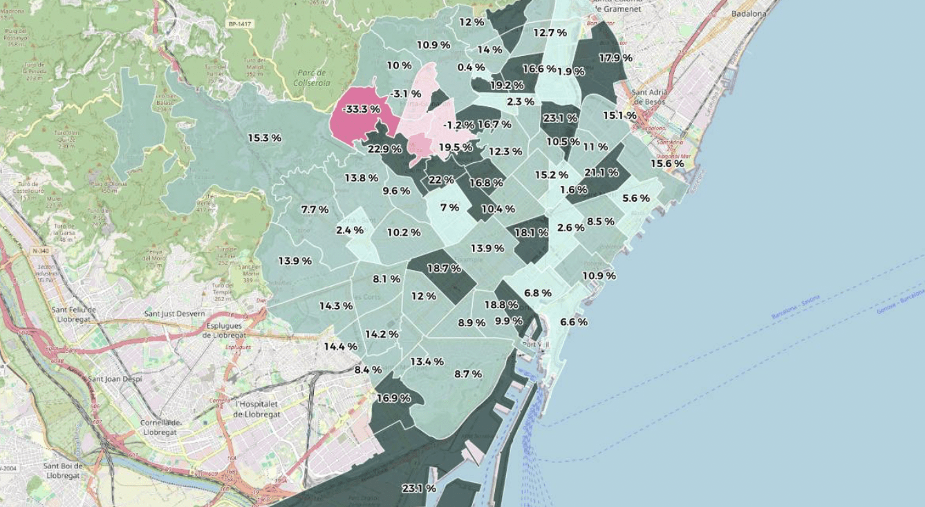 Comment le prix des loyers a-t-il évolué dans les différents quartiers de Barcelone ? Sur les 71 quartiers que compte Barcelone, seuls six ont enregistré une baisse des prix au cours de l’année écoulée. Les loyers les plus élevés ont augmenté dans les quartiers de Verdun (38,3%), La Sagrera (23,1%), La Marina Del Prat Vermell (23%) et Vallcarca I Els Penitents (22,9%).