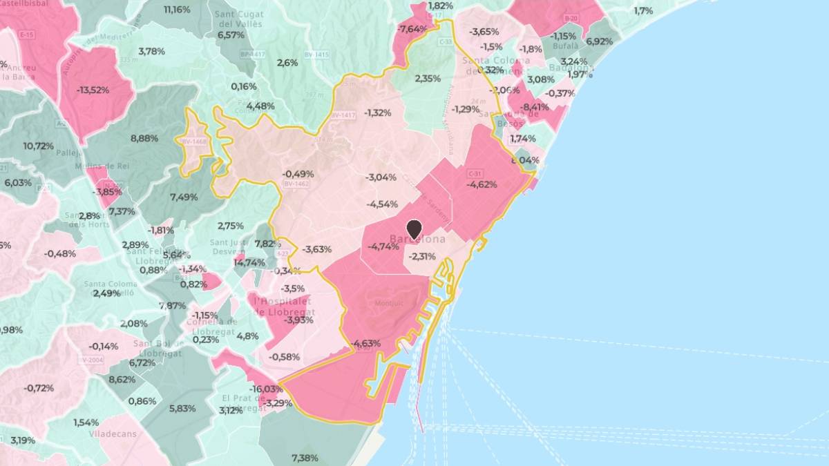 Le prix moyen des logements a augmenté de plus de 10 % par rapport au taux interannuel dans certains quartiers de Barcelone, tandis que dans d’autres, il a baissé de plus de 8 %, selon les données de Brains Real Estate. (Brainsre.news)