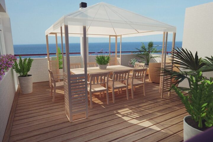 Magnifique attique duplex situé au dixième étage de l’immeuble Hipocampos en première ligne de la plage de Levante. Il possède une superficie totale de 327 m2 dont 165m2 correspondent à la superficie